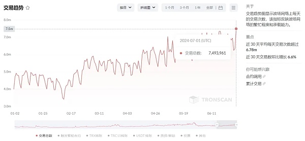 区块链浏览器TRONSCAN数据显示,7月1日,波场TRON交易数超749万,创本年度新高。近30天,波场TRON日均交易数超过678万,环比增长6.6%。