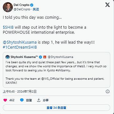 柴犬生态系统目前正在经历巨大的变化。例如,柴犬技术负责人 Shytoshi Kusama 的最新推文引发了空间的重大转变。Kusama 透露,他将在即将在日本京都举行的 IVS2024 活动中展现自己的个性,这一进展让柴犬社区兴奋不已。