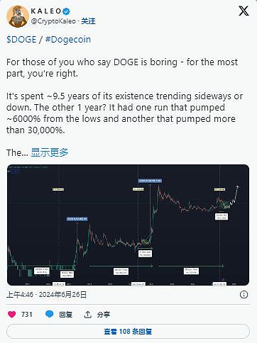 Big Mike 肯定不是唯一一个持这种观点的人,另一位分析师预测狗狗币的价格明年将上涨至 2 美元。加密货币分析师 Kaleo最近预测,狗狗币将受益于“模因币超级周期”,这将使狗狗币的价格远远超过美元大关。他的预测指出,“在它发生之前,我们很可能还有一点时间做准备。”