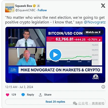 诺沃格拉茨周二对CNBC表示:“无论谁赢得下次选举,我们都将获得积极的加密立法——我知道这一点”,并指出他“并不是一个只关注单一问题的选民”。