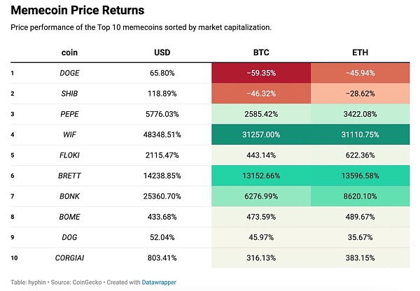 从百分比来看,memecoin 的总估值并没有像人们预期的那样发生太大变化,因为 Dogecoin 和 Shiba Inu 等代币占据了近一半的 memecoin 市场份额,而涨幅却微乎其微。除了一些在以太坊上大获成功的代币外,大部分的 memecoin 活动都发生在 Solana 和最近的 Base 上。回报率最高和新晋市值前十名中的 3 个 memecoin 都来自 Solana,其中有两个代币的回报率甚至超过了五位数。