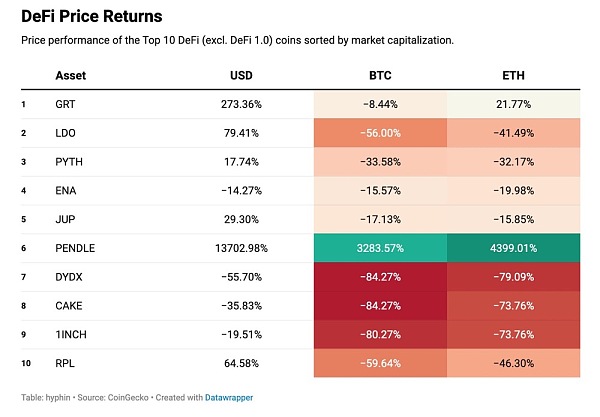 价格回报计算方法:(当前价格-初始价格) / 初始价格 * 100。为考虑到最近推出的、在其赛道中排名靠前的产品,初始价格从 2022 年 11 月 21 日或 CoinGecko 上的第一个条目开始查询。当前价格则为撰写本文时( 2024 年 6 月 18 日)查询的价格。