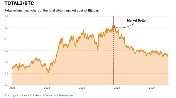 为了更好地说明这一现象,我们可以绘制比特币与山寨币市场(不包括以太坊)的对比图,以显现比特币的持续升值。