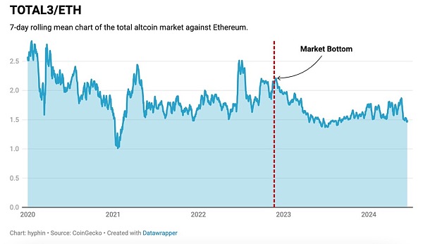 山寨币整体市值与以太坊市值的 7 天滚动均值比