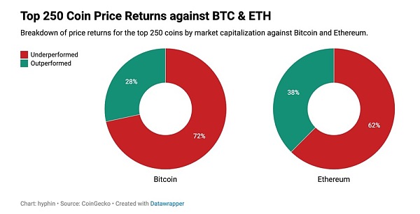 市值前 250 的山寨币与比特币和以太坊的价格回报对比
