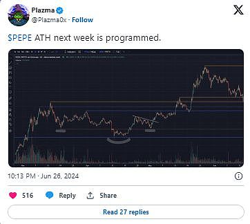 此外,多位分析师对这款 meme 币给出了积极的预测。PEPE 市场的情绪似乎正在发生变化。分析师 Plazma 指出,PEPE 维持在关键的长期支撑位之上。该分析师还认为,PEPE 将从这一水平反弹并开始朝着新的 ATH 方向发展,他认为这将在下周发生。