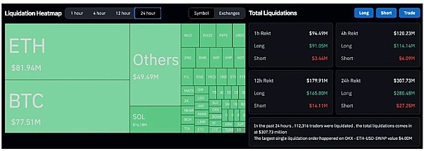 比特币持续下杀的行情,据Coinglass数据显示,过去24 小时,加密货币全网爆仓金额已超过3 亿美元(多头占2.8 亿美元),有超11 万人遭清算(今晨九点时才接近9 万人而已)。