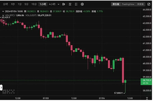 比特币的跌势未歇,稍早十点左右大跌一根插针57,800 美元,创下近两个月来最低价格。撰稿当下报58,755 美元,近24小时下跌4.22 %,洗盘是否结束?是否会跌破五月前低的56,555 美元还需要进一步观察。