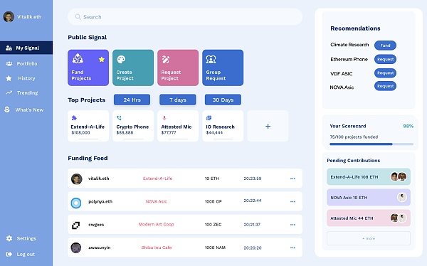 Public Signal 是一个融资平台。目前,主流的公共物品融资平台如 Kickstarter 通常采用项目制,即需要资金的项目方在平台上发布自己项目的相关信息,资助方决定是否进行捐赠。这是一个需求方市场。而 Public Signal 的不同之处在于,其基于意图的架构允许资金供给方表达需求,比如他们可以设立一个「向地球生态恢复项目进行捐赠」的意图,并对该意图进行捐赠。