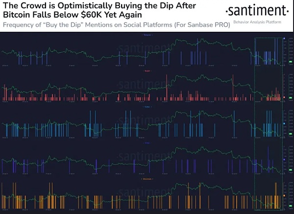 比特币市场分为两派,一派在价格下跌时迅速抛售,另一派则继续囤积。Santiment 的数据显示,散户买家正在积极购买价格低于 60,000 美元的比特币。Santiment 表示,