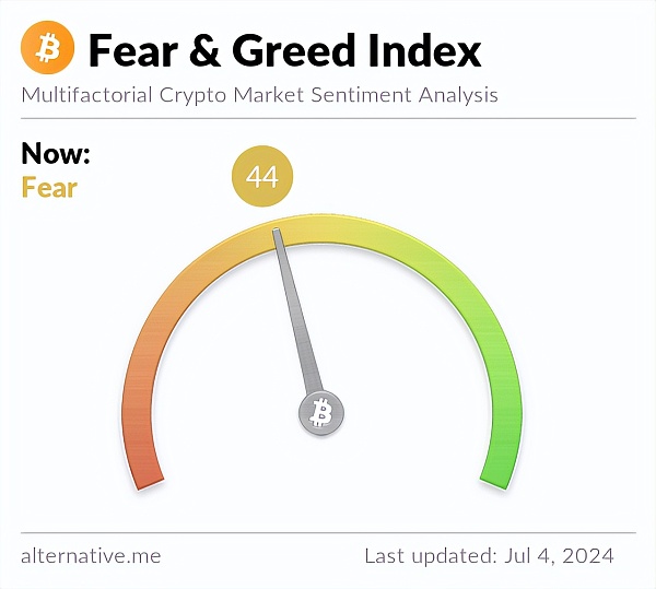 上图显示,在比特币最近一次下跌后的两天内,Reddit、X、4chan 和 Bitcoin Talk 上“逢低买入”的提及次数翻了一番。此外,衡量投资者对比特币和整个加密货币市场态度的加密货币恐惧与贪婪指数目前处于“恐惧”区域,得分为 44(满分 100)。6 月 25 日,该指数跌至 18 个月来的最低点 31,此后一直在 30 至 53 之间波动。