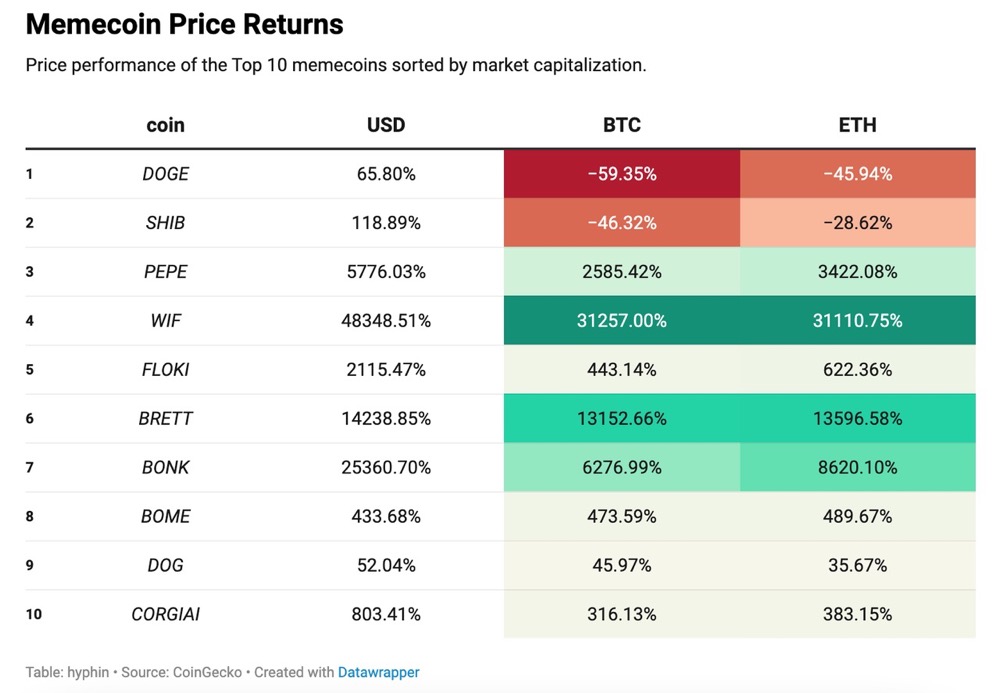 memecoin在过去一年里因其高回报率吸引了大量投资者,但整体市场估值变化不大。尽管Dogecoin和Shiba Inu等代币占据了近一半的memecoin市场份额,但涨幅有限。部分在以太坊上表现优异的代币带来了高回报率。