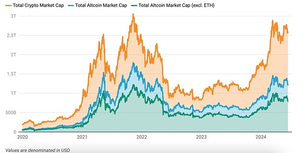 过去一年半中,全球加密货币市值显著增长,但波动性较小。比特币价格屡创新高,但山寨币未能跟上比特币的增长速度,导致市场表现不如预期。数据显示,比特币在本轮牛市中占据了更多的市场份额,而山寨币的表现相对较弱。