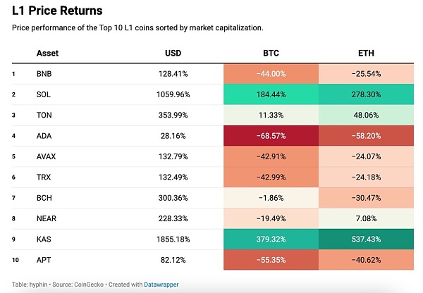 L1代币因其稳健的价格走势和市场主导地位备受关注。尽管一些项目的回报率较高,但大部分L1代币未能超越比特币和以太坊。L2代币则因其可扩展性和低交易费用而成为链上生态的重要组成部分,但回报率平平。