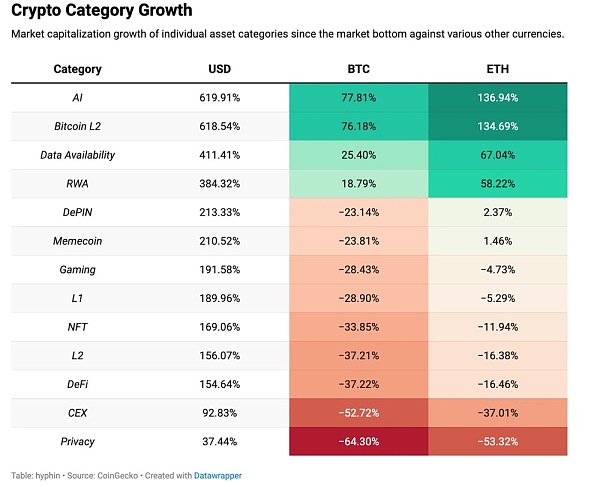 尽管山寨币市场表现不佳,但识别市场趋势和叙事仍然至关重要。流动性的分散和交易量的下降使大部分涨幅集中在少数领域。尽管整体增值微乎其微,但个别资产类别表现出色。例如,memecoin和DeFi项目在某些情况下表现优异。