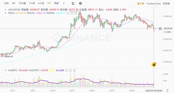 昨日比特币持续下跌,在美国独立纪念日交易清淡之际,一度下跌至 56,771 美元。BTC 头部形态完整,跌破颈线位置后,也引发多头遭清算,根据 Coinglass 的资料,过去 24 小时内,有 122,519 人被清算 ,总金额为 3.7 亿美元,其中比特币占了 1.26 亿美元。