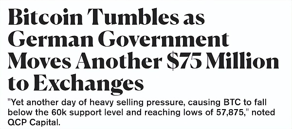 Arkham数据监测,标记为“德国政府”的巨鲸钱包地址向Bitstamp、Coinbase和Kraken合计转移了1300枚比特币,约合7553万美元。