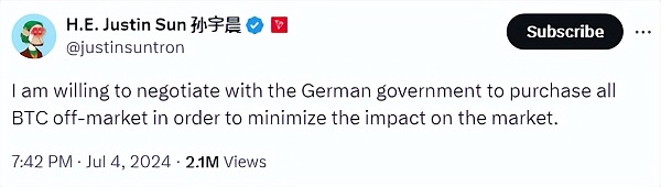 波场TRON创始人孙宇晨(Justin Sun)推文称:“我愿意与德国政府协商,在场外购买所有比特币,以尽量减少对市场的影响。”