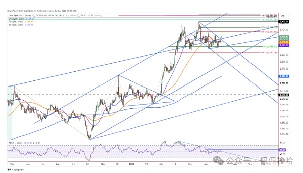 日收盘价高于2369美元的波动高点将确认短期趋势的看涨发展,而短期趋势受到看涨长期趋势的影响。本周长期上升趋势的变化不仅体现在下跌通道的突破,还体现在50日均线和长期上升趋势通道线的看涨突破。自4月初以来,该线多次被市场视为支撑或阻力。周三的突破是对该长期模式4月份首次看涨突破尝试的一次新尝试。