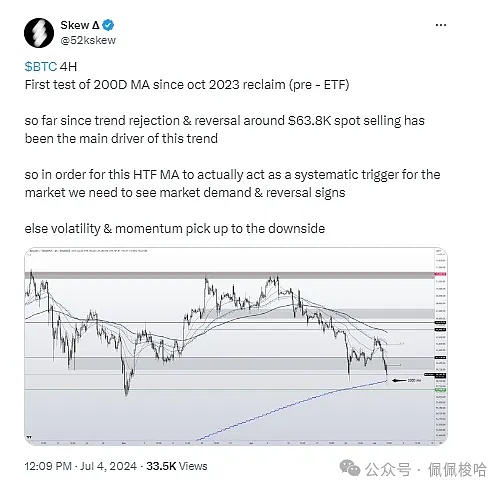 分析师Skew提到,比特币价格自2023年10月以来首次重新测试200天EMA。据该分析师称,比特币最新下跌是由64000美元左右的趋势拒绝和逆转推动的。因此,为了使HTF MA真正成为市场的系统性触发器,需要看到市场需求和反转迹象。