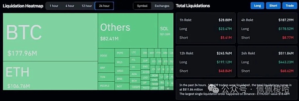 在比特币反复洗盘的行情下,根据Coinglass的数据,过去24小时内加密货币全网爆仓金额超过5.1亿美元,是昨日的两倍,有超过18.8万人遭遇清算。