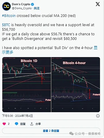 至于比特币持续下跌的下个支撑位在哪?加密技术分析师Dom's Crypto昨晚在X上表示,关键支撑点位200 MA(58,484美元)已经跌破,接下来支撑点位会在56,700美元。