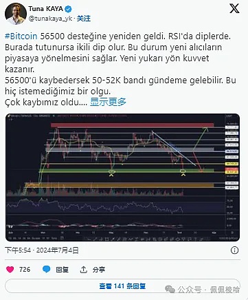 另一名分析师Tuna KAYA表示,比特币的支撑位在56,500美元。如果该点位无法守住,比特币可能会下探至50,000美元至52,000美元。