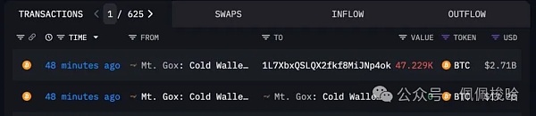 交易所Mt.Gox 今晨将47,228 枚BTC(高达27 亿美元)从冷钱包转移到(1L7Xb…)开头的钱包,比特币也在相同时间最低插针至56,680 美元。