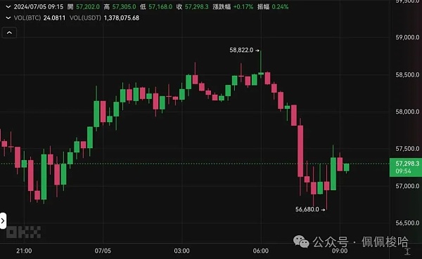 受此影响,比特币在相同时间最低下探至56,680美元,接近5月1日创下的前低56,552美元。撰稿时,比特币回弹至57,298美元,近24小时下跌4.89%。