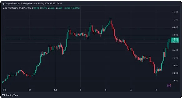 ZRO 的价格从 2.73 美元左右的低点上涨至接近 4 美元,在加密货币市场暴跌的时候上涨了 40% 以上。