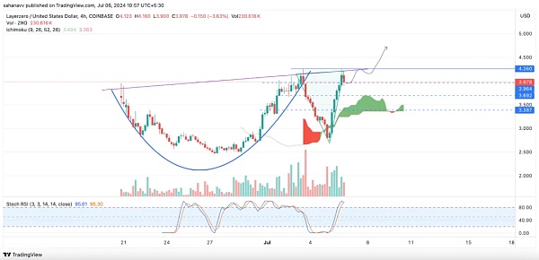 StochRSI 已经进入超买区域,预示着可能会出现反转。同时,Ichimoku Cloud 在经历了一段时期的看涨情绪后转为看涨状态。因此,预计 LayerZero (ZRO) 价格将保持健康上升,可能会突破 4 美元关口,并进一步攀升至 4.5 美元以上,创造接近 4.74 美元的新历史高点。然而,在 5 美元的关键阻力前,可能会面临空头力量的阻碍,需要等待一段时间才能突破上方位置。