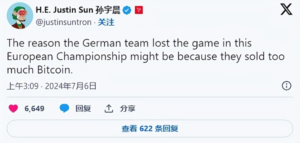 孙宇晨酸爆:德国队输掉欧洲杯 是因为卖太多比特币