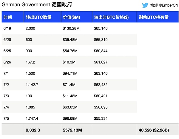 德国政府在今年1 月中旬从盗版电影网站Movie2k没收了将近50,000 枚比特币,成为德国历史上最大规模的加密货币扣押案例。而据链上分析师余烬统计,德国政府地址从6 月19 日至今共转出9,332.3 枚BTC(分九次转移),价值约5.72 亿美元,转出均价为61,306 美元。