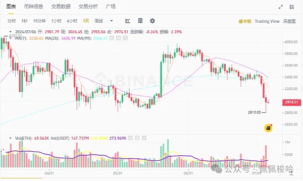 截稿前暂报2974.51美元,近24 小时下跌2.39%。