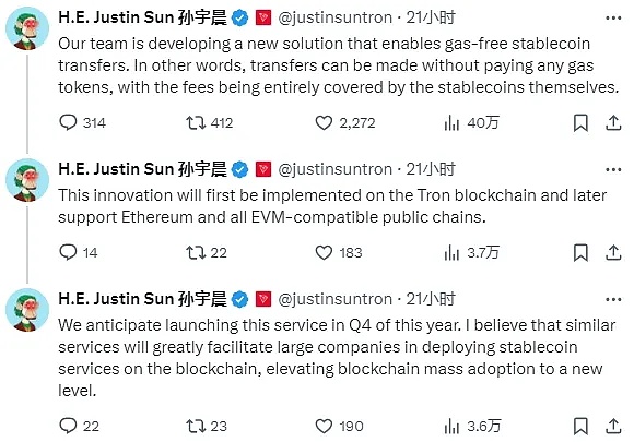 7月6日,波场TRON创始人孙宇晨在社交媒体表示:“我们的团队正在开发一种新的解决方案,实现无Gas稳定币转账。换句话说,转账无需支付任何Gas代币,费用完全由稳定币本身承担。该创新将首先在波场区块链上实现,随后支持以太坊和所有与EVM兼容的公链。我们预计在今年第四季度推出这项服务,我相信类似的服务将极大地方便大公司在区块链上部署稳定币服务,并将区块链的大规模应用提升到一个新的高度。”