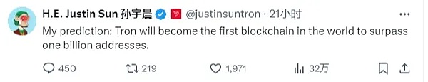 此外,孙宇晨还预测认为波场TRON将成为世界上第一个地址数超过10亿的区块链。