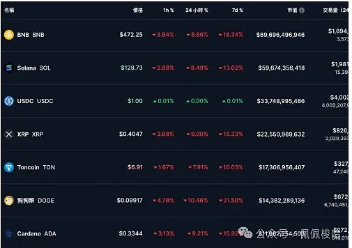 比特币下跌趋势下,其他前十大代币也同步下跌。下挫最深的是狗狗币(DOGE)超10%,其他如BNB、SOL、XRP、ADA 等代币也都有超8 %的跌幅。