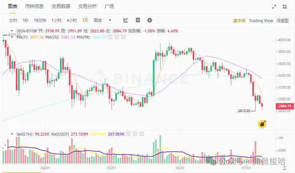 以太坊走势也与比特币接近,撰稿当下跌破2,890 美元,近24 小时下跌4.40%。