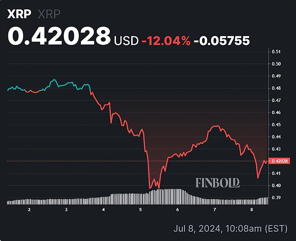 截至本文撰写时,XRP 交易价格为 0.42 美元,过去 24 小时内下跌超过 4%。在周线图上,该代币下跌了 12%。