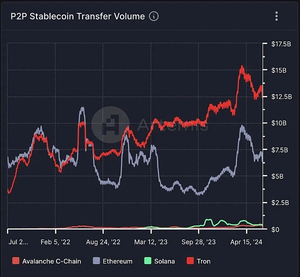不过,TRON仍然有其独特的优势。作为一个较早进入加密货币市场的项目,TRON在技术积累、生态建设等方面已经较为成熟。而且数据指出,波场目前在P2P稳定币转帐市场上的市占率高居第一,波场上的P2P稳定币转帐金额,始终是以太坊上的2-3倍,这表明波场促进了更多的稳定币支付和转帐活动。