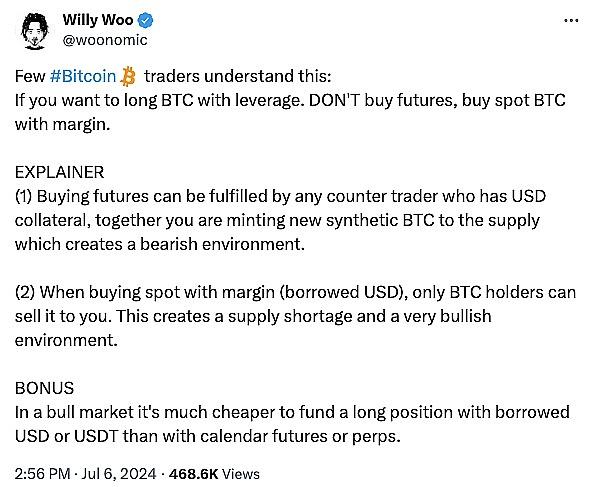 「(2) 当使用保证金(借入美元)购买现货时,只有 BTC 持有者才能将其出售给你。这就造成了供应短缺和非常看涨的环境。」