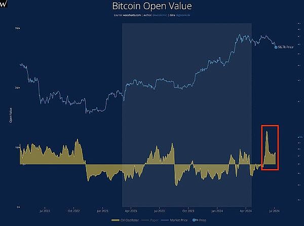 隔夜 BTC (比特币) 向55k跌落,作势回补7月5日插针后的自动反弹(53.3k-56.7k)。之前文章中介绍过Willy Woo的一个数据分析。其指示出,合约市场中存在大量的所谓“纸BTC”,即仅以美元稳定币为抵押物合成出来的“虚假”BTC,从而给BTC上涨带来了巨大的阻力。