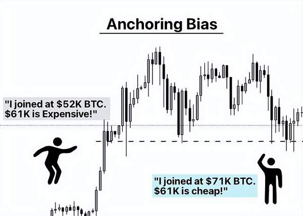 交易者往往会对某个特定的价格(锚)产生固执的依赖,影响其决策。例如,如果交易者在BTC价格为52,000美元时入场,他们可能会认为61,000美元的BTC价格过高,而另一个在71,000美元时入场的交易者则会认为同样的价格偏低。克服锚定偏差的关键在于客观分析市场情况,而非依赖过去的价格点。
