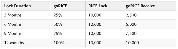 RICE Locker 提供了四种 Lock 时长选项:90 天、180 天、270 天、360 天。时长不同,兑换 goRICE 的比例不同,公式如下:
