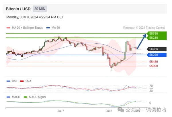 CMTrade表示,比特币RSI高于其中性区域50,MACD为正值且高于其信号线,配置为正值。
