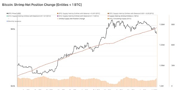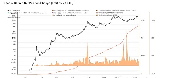 比特币的“虾人”群体在过去一年中表现出了显著的活动变化。持有少于 1 BTC 的实体表现出不同程度的增持,反映了对市场波动的敏感性。图表显示,随着 2024 年初比特币价格的大幅上涨,“虾人”大幅增持,并在 2024 年 3 月左右达到峰值。这与比特币的历史最高点相吻合。