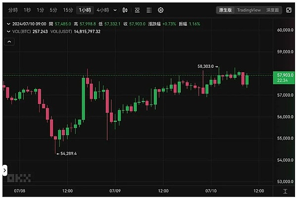 近期在德国政府持续出售比特币、Mt. Gox 交易所开始向债权人还款背景下,比特币多次下探。不过昨日BTC 在震荡中持续向上攀高,今(10)晨多次突破5.8 万美元,多空交战激烈。