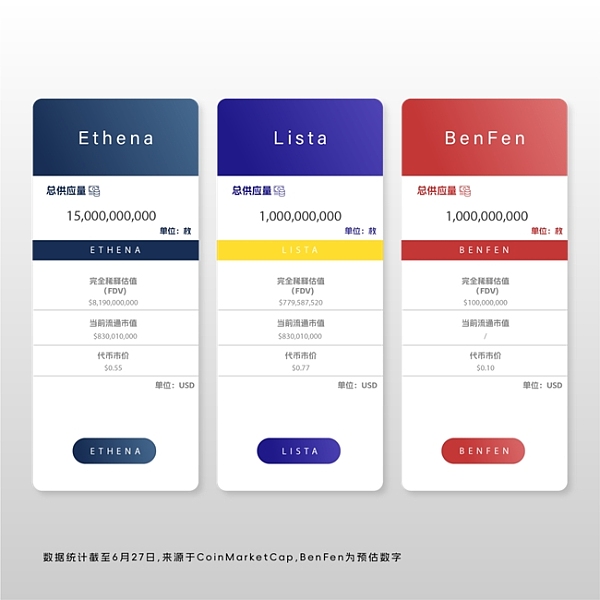 1、极具吸引力的初始预估估值:BenFen的初始完全稀释估值(FDV)为1亿美元,远低于Ethena(约100亿美元)和Lista(约10亿美元)。对用户而言,这意味着: