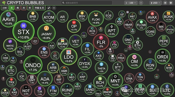 比特币在昨天突破59000美金后没站稳,目前回到了57500美金震荡,以太坊在3100美金左右震荡。山寨币中,表现最为强势的是比特币生态的STX和SATS,他们上涨都超过了15%。