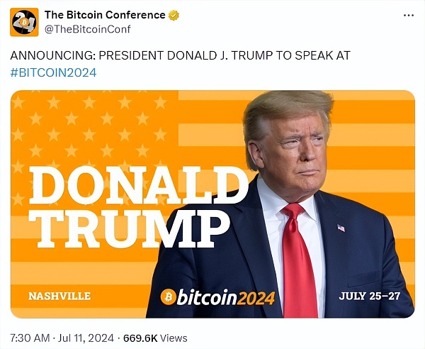 The Bitcoin Conference官方推特账号证实,特朗普将在今年比特币大会上发表讲话。随后,Bitcoin Magazine、CoinDesk等知名币圈媒体也跟进报道了此事。